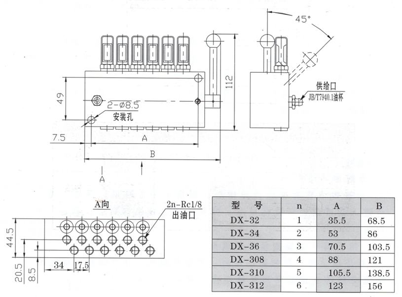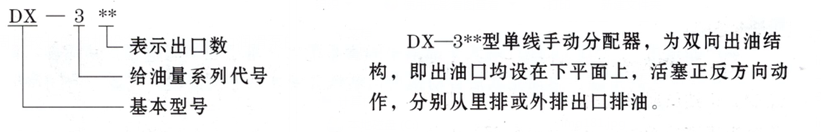 DX-3**型单线手动分配器适用于润滑点少,给油周期较长的单机设备上,通过移动润滑泵的供油软管与本分配器进油油杯连接向润滑点给油。