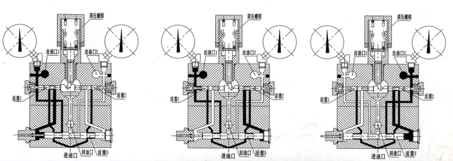 当活塞l左端压力(出口压力)克服弹簧对活塞的作用力后,活塞l右移,同时活塞2右移(图2)。当活塞l、活塞2移到阀体右端后,活塞3左侧与回油口通;压力油经活塞2内腔道作用在活塞3的右侧,推动活塞向左移动到达阀体左侧(图3)。此时活塞3右腔内压力油经出油口2流出,而左端的压力油被活塞l封死。当活塞2右端压力(出口压力)克服弹簧对活塞的作用力后,活塞2左移,同时活塞l左移。当活塞l、活塞2移到阀体左端后,活塞3右侧与回油口通,压力油经活塞l内腔道作用在活塞3的左侧,推动活塞3向右移动达阀体右侧(图1),完成一个工作循环。