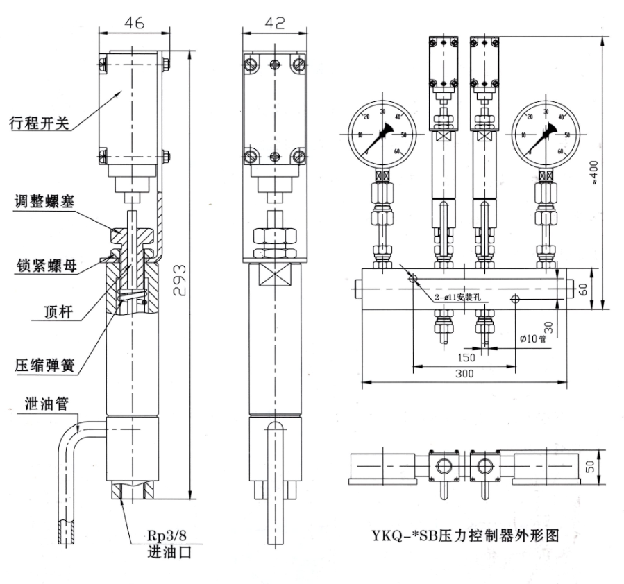 YKQ系列压力控制器是一种柱塞加弹簧预压结构的压力控制发讯元件。它具有体积小、重量轻、使用方便等特点,适用于单、双线干油集中润滑系统中,安装在主管路前端、中部或末端,检查主管路内压力情况,当主管路内压力达到其设定值时,向电控箱发出信号,控制系统中的换向阀换向或监视系统的工作情况。