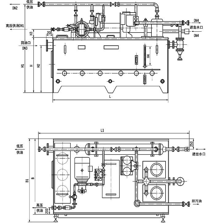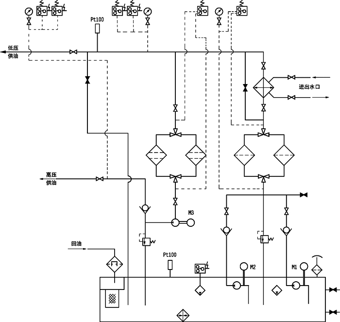 本油站为整体式,由油箱、两台低压油泵、一台高压油泵、二台双筒网片式过滤器、回油磁网过滤装置、列管式油冷却器、各种控制阀门、管道以及电接点压力表、铂热电阻等组成。