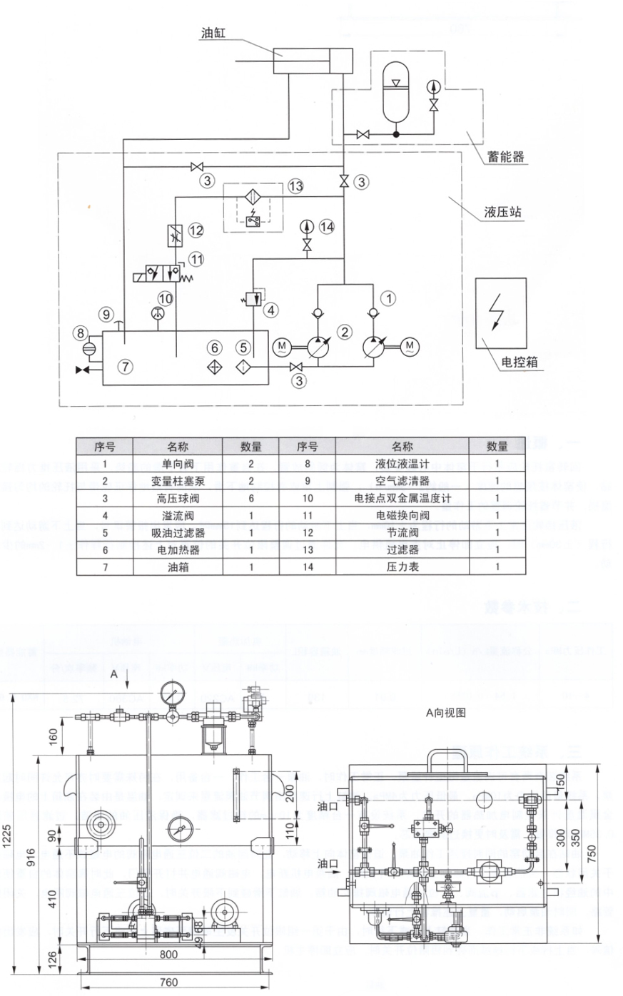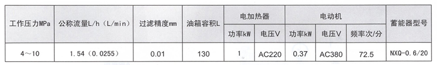 系统装有两套可调流量微型计量泵,正常工作时,油泵一台工作,一台备用,在特殊需要时亦可允许同时起动两泵,系统 高压力为10MPa, 低压力为4MPa,油缸上行速度由调节油泵流量来调定,油温是由装在油箱上的电接点双金属温度计来控制电加热器的开关,系统设有一台精度为10um的精过滤器,保障液压油的清洁。过滤器压差达到0. 35MPa时报警,需及时 换过滤器滤芯。