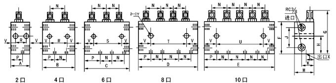 4、在分配器上下对应出油口间设有合二为一的并油结构,易改奇数出油,使用时只需将孔内的螺钉拧出,把上或下不用的那个出口用Rl/4螺塞封堵即可。