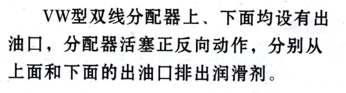 双线分配器有两个进油口,分别与两个供油管5a. 5b连接,当其中一条由润滑泵供油时,另一条则向贮油器开放。