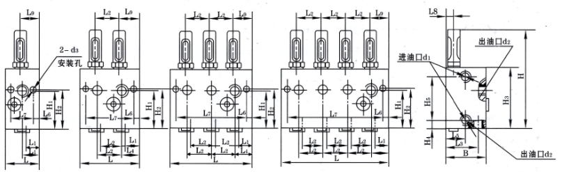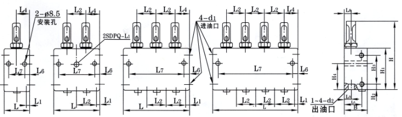 SDPQ-L系列单向出油的双线分配器,只在下面有出油口,活塞正向、反向排油时都由下出油口供送润滑脂。其形式与尺寸见图和表的规定