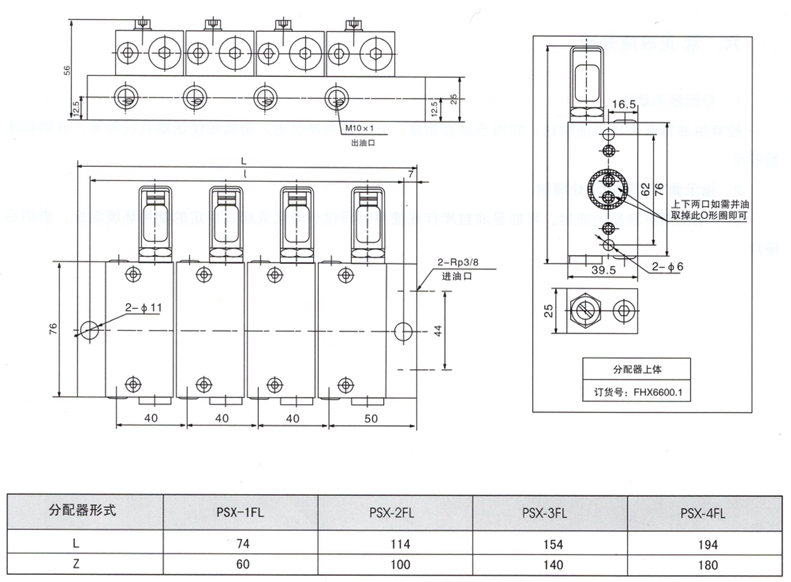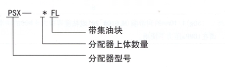 PSX-★FL型分配器是由一个集油块和(1-4)块分配器上体组成。有故障时,只需 换分配器上体,不需换整块分配器,维修方便。分配器的出口设在集油块的两侧,同一块分配器上体的两个上体的两个出油口还可进行合并,增加给油量。
