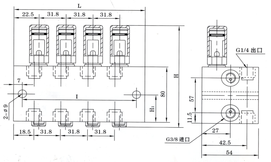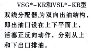 双线分配器设有左右侧二处进油口,出油根据结构不同可分为单向出油和双向出油二种,标准形式均带有油量调节装置,在高温等特殊工作条件下可不配带油量调节装置。
