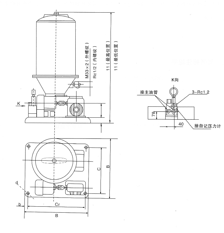 4、向贮油器内补脂需要用DJB-F200或DJB-V400型电动加油泵,从贮油器的加油口加入,注意当贮油器无润滑脂时,严禁启动电动干油站。