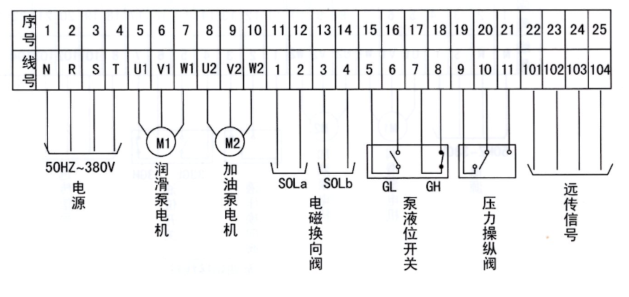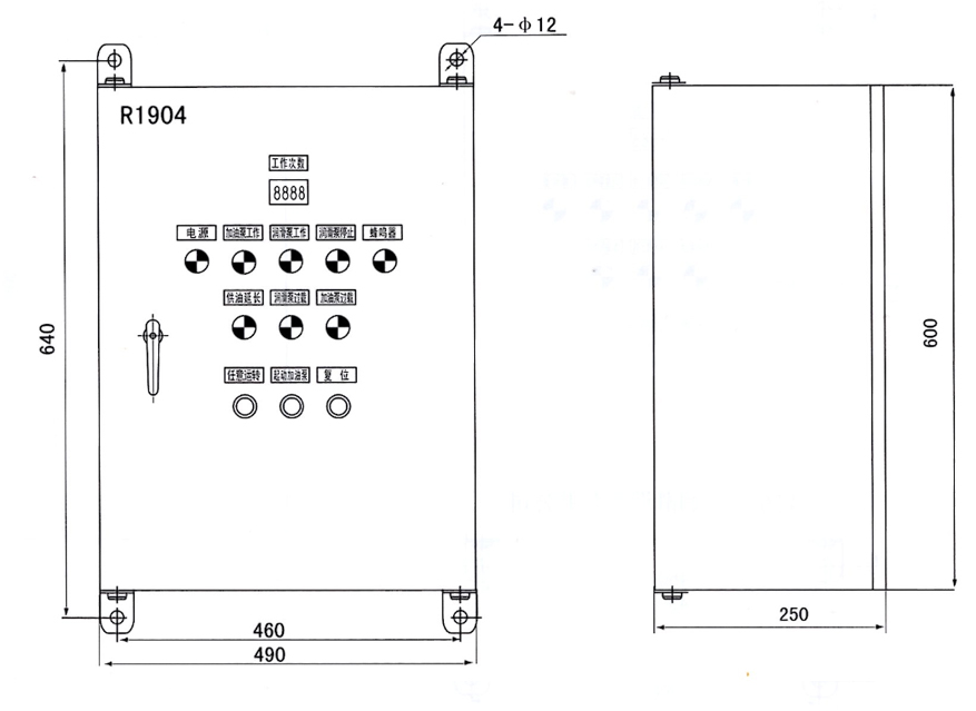 R1904型电控箱,用于自动控制一套由U-※※AE型终端式电动润滑泵与补脂泵组成的干油润滑系统,即在DEA-2E 型电控箱的基础上,增加了补脂泵自动控制部分。能对系统中的供油点实现自动供油,供油完成后,自动停止。油箱中液位低于 限度时,补脂泵自动启动,注满油后,自动停止。
