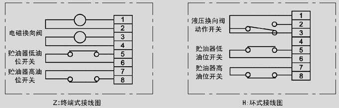 终端式结构电动润滑泵配用电磁换向阀,有二个接口,外接二根供油主管,依靠电磁铁的得失电实现换向供油。 柱塞泵换向阀的动作原理详见使用说明书。